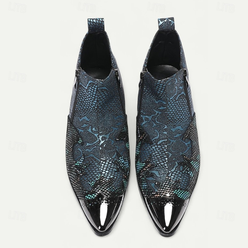 Men's Blue Snakeskin Pointed Toe Ankle Boots – Rock Star Cowhide Zip-Up Boots for Concerts, Festivals and Themed Occasions 6