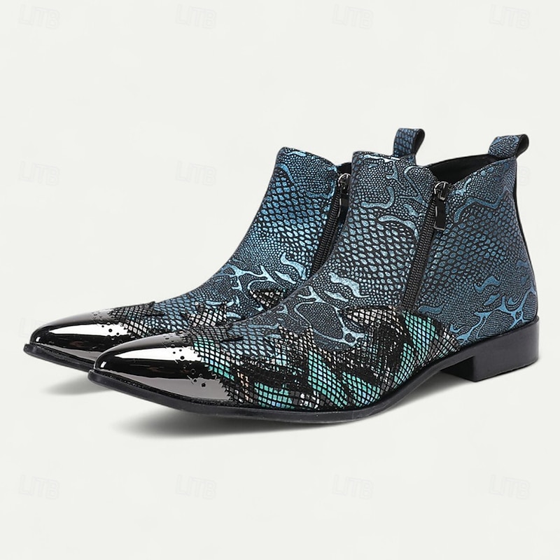 Men's Blue Snakeskin Pointed Toe Ankle Boots – Rock Star Cowhide Zip-Up Boots for Concerts, Festivals and Themed Occasions 1