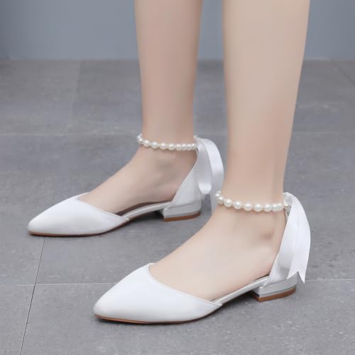 Women's Pearl Satin Wedding Shoes Pointed Toe Comfortable Bridal Flats Formal Prom Party Dress Pumps Ankle Strap Sandals 6