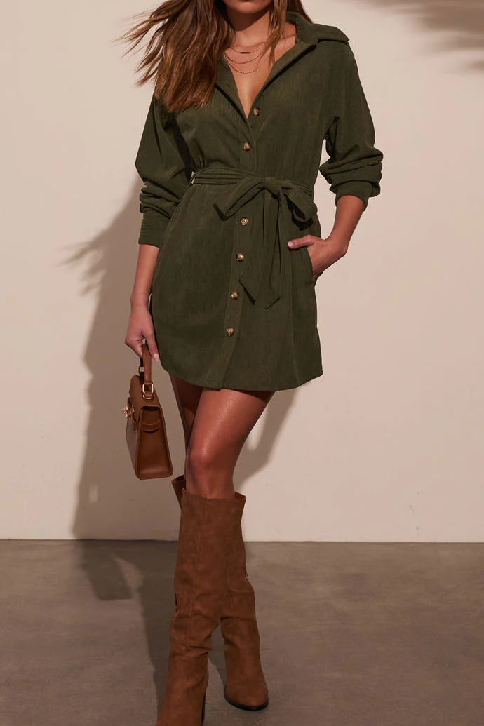 R.Vivimos Corduroy Cotton Mini Dress Fall Winter 2025 Casual Long Sleeve Button Down Belted Shirt Dress with Pockets 10