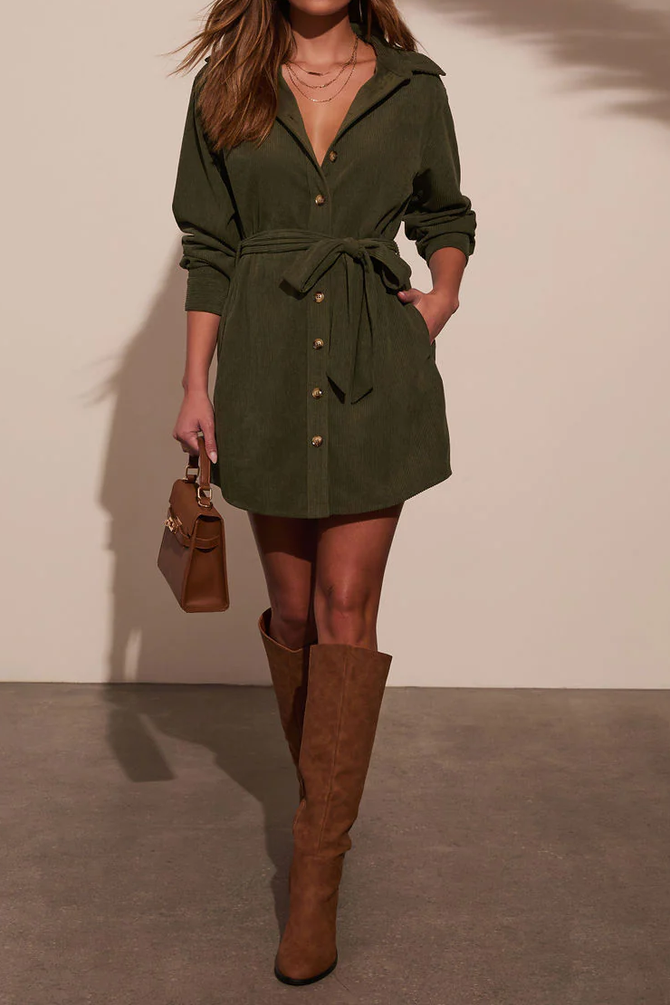 R.Vivimos Corduroy Cotton Mini Dress Fall Winter 2025 Casual Long Sleeve Button Down Belted Shirt Dress with Pockets 1
