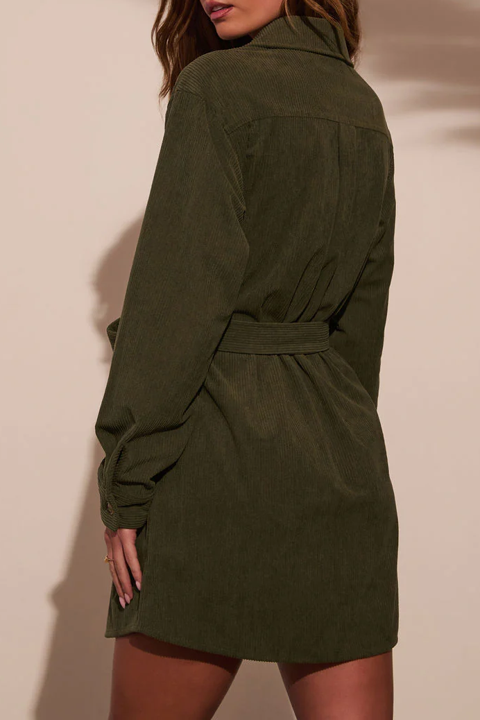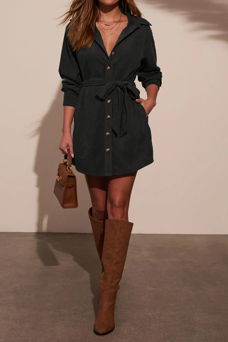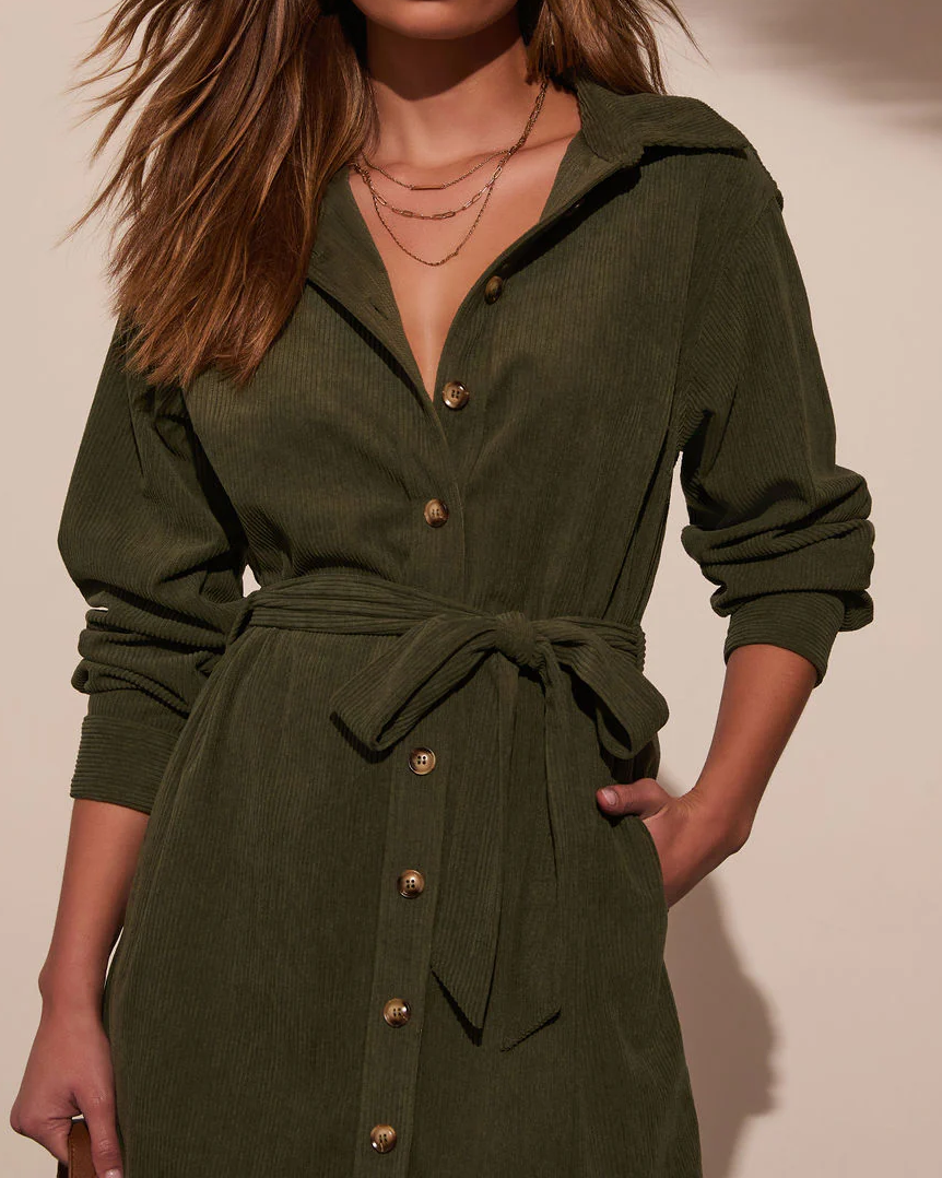 R.Vivimos Corduroy Cotton Mini Dress Fall Winter 2025 Casual Long Sleeve Button Down Belted Shirt Dress with Pockets 4
