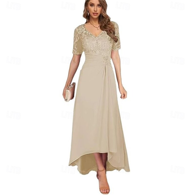 More information about A-Line Mother of the Bride Dress Elegant Simple V Neck Asymmetrical Chiffon Short Sleeve with Solid Color