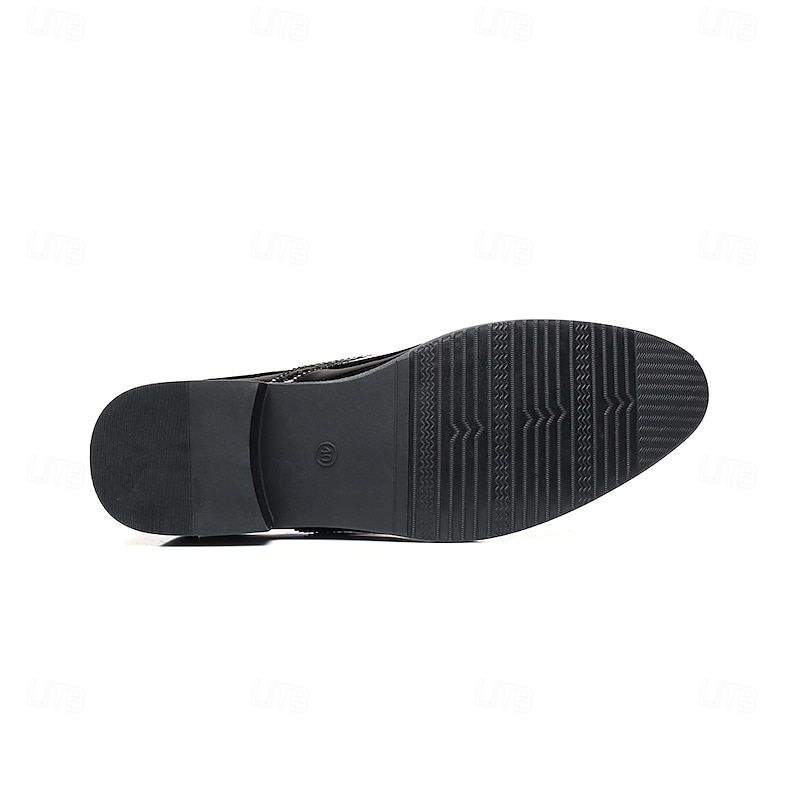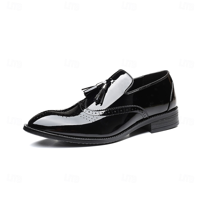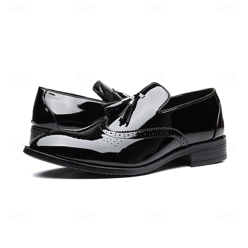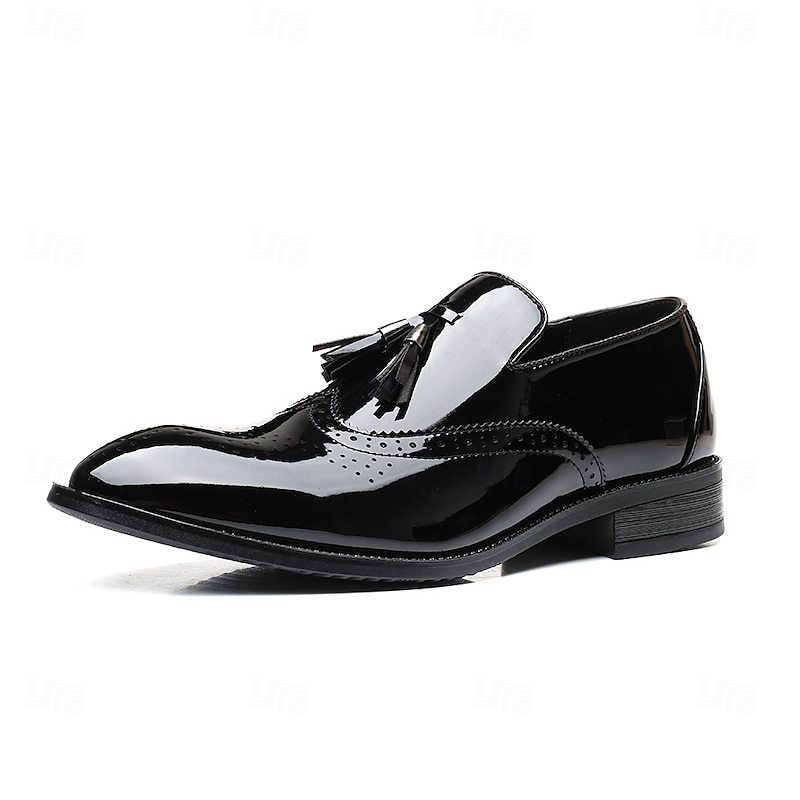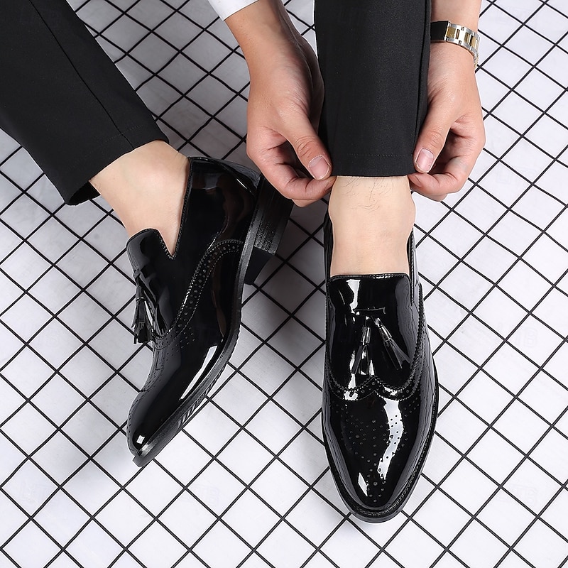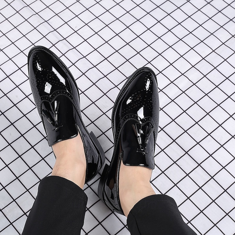 Highlights [Fabric] : Crafted from premium PU leather, these men's loafers feature a glossy finish that perfectly mimics polished patent leather, offering a sophisticated and fashionable look for formal settings. The high-quality materials ensure both comfort and a luxurious appearance. [Silhouette] : With a streamlined slip-on design, these loafers provide ease of wear and a comfortable fit. The sturdy rubber outsole contributes to a stable and confident stride, making them ideal for all-day wear at formal events. [Design Highlights] : The loafers boast delicate brogue detailing that adds a timeless and classic touch to the sleek, minimalist design. The tassel embellishments on the vamp enhance the shoes' elegant aesthetic, while a round toe shape offers a contemporary feel. [Occasions] : Perfect for formal occasions such as weddings, business meetings, and upscale parties, these loafers add a touch of charm and sophistication to any outfit. They are designed to complement a wide range of formal attire, providing both flair and functionality. [Size Range] : Available in a variety of sizes, these shoes cater to a wide size range from US6-6.5 (EU38) to US12 (EU45), ensuring a perfect fit for every discerning gentleman.