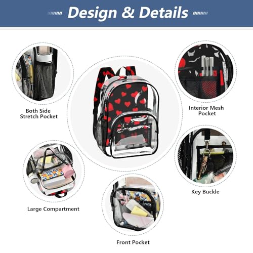 Red Hearts Doodles Black Clear Backpack Women Cute Girls Backpack for Kids Approved See through Bag 7