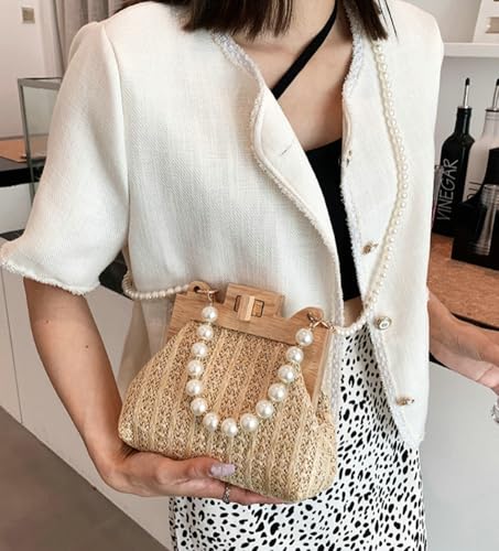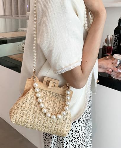 Women’s Straw Shoulder Bag Woven Beach Top Handle Handbag Purse Stylish Pearl Crossbody Bag for Summer Travel 6