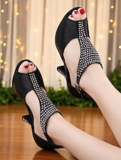 More information about Women's Satin Latin Dance Shoes with Rhinestone T-Strap and Mid Heels, Professional Ballroom Salsa Sandals for Competition or Practice