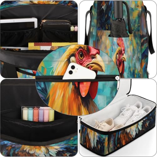 Travel Duffel Bags Colorful Watercolor Rooster Foldable Weekender Bags for Women with Shoes Compartment Waterproof & Tear Resistant Carry on Overnight Luggage Duffel Bag Shoulder Sports Tote Bag,B-39 6