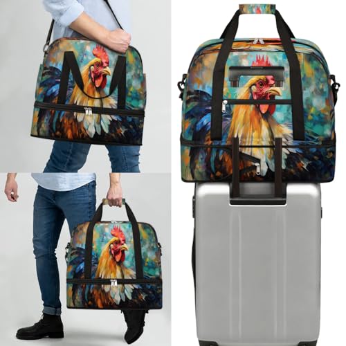 Travel Duffel Bags Colorful Watercolor Rooster Foldable Weekender Bags for Women with Shoes Compartment Waterproof & Tear Resistant Carry on Overnight Luggage Duffel Bag Shoulder Sports Tote Bag,B-39 5