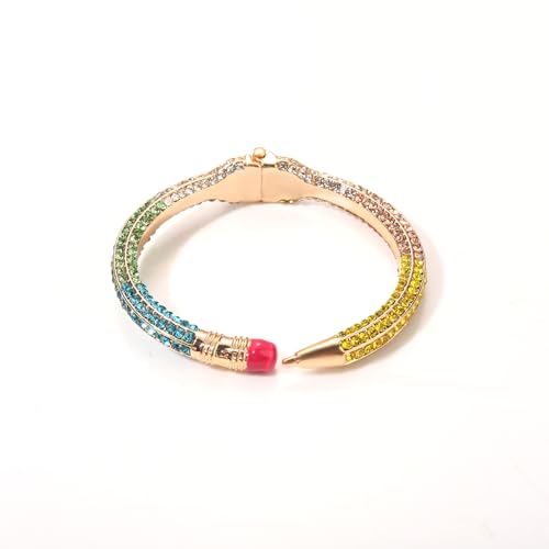 • Material & Size -It's back to school with this whimsical bracelet! Sparkly cuff bracelet featuring a playful pencil silhouette adorned with colorful rainbow pavé. funny pencil Bracelet has an easy hinge closure. Made from metal and glass crystal. A minimalistic style to highlight your look with sophistication and refinement.pencil bangle bracelet diameter:2.5inch