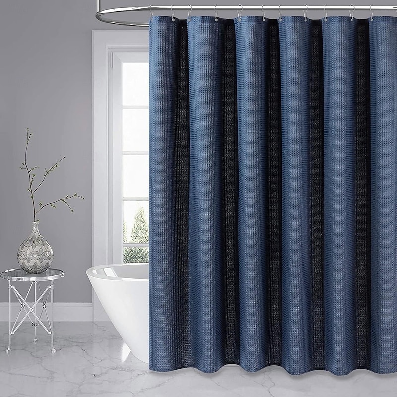 Highlights HEAVY WAFFLE FABRIC - Waffle weave textured, which is non-toxic, wrinkle-resistant, and non-fading, which means more heavy duty and last longer than other items in the market. Extra strong fabric and can keep its shape and does not billow like lightweight shower curtains. RUST-RESISTANT METAL GROMMET HOLES - The 72 x 72 size shower curtain have 12 stainless metal grommets and 12 free plastic hooks to guarantee no rust. EASY TO CLEAN - The modern shower curtain is machine washable in cold water, dries quickly. Extra strong fabric and tight hem could avoid shrinkage and deformation. VERSATILE OPTIONS - Multi color options and classy designs makes this fabric shower curtain perfect for any bathroom. Whether you are redecorating your master bathroom, guest bathroom, this shower curtain is a wonderful option for you. WARM TIPS - The heavy-duty shower curtain can resist water to some degree. Only a little bit of water will soak through, and most of the water will form water drops on the surface and quickly be repelled. Recommend using together with waterproof plastic shower curtain liner, If you pursue higher water resistance.