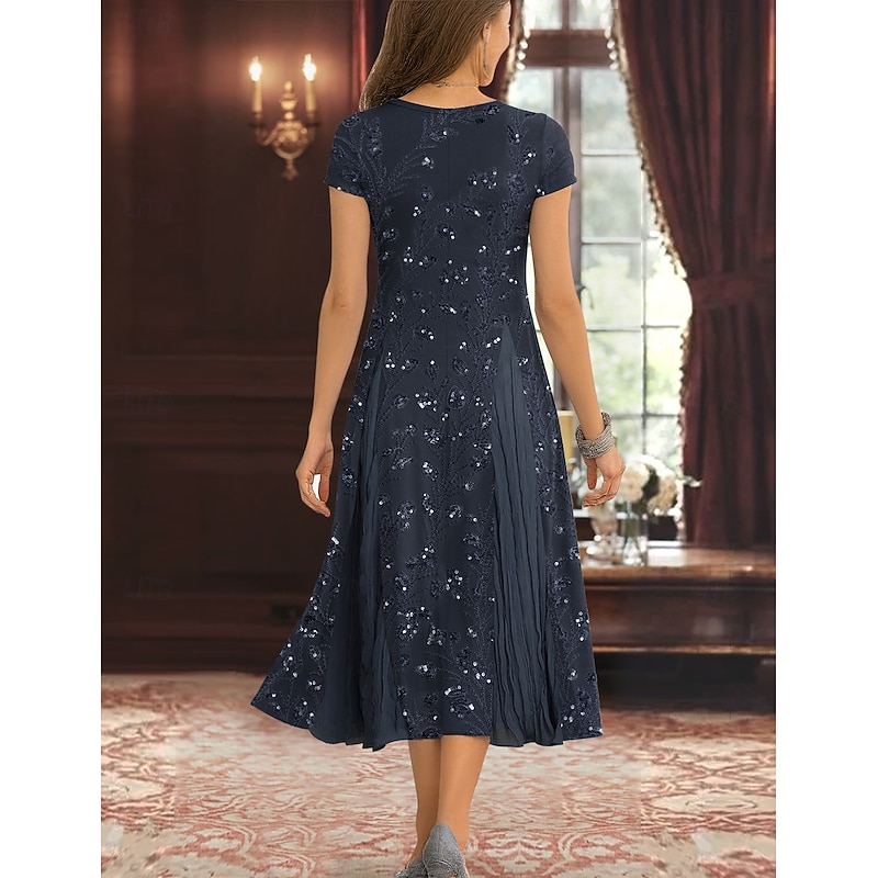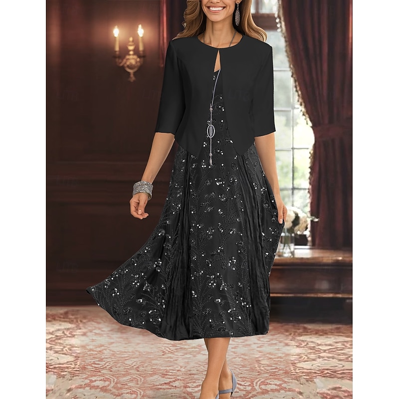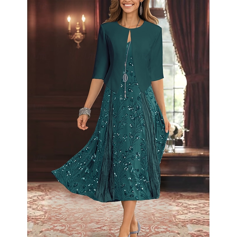 More information about Two Piece A-Line Mother of the Bride Dress Elegant Simple Luxurious V Neck Tea Length Midi Length Beaded Lace Chiffon with Stretch Crepe Jacket
