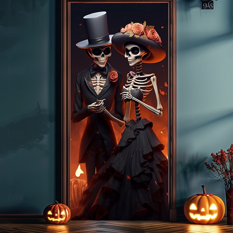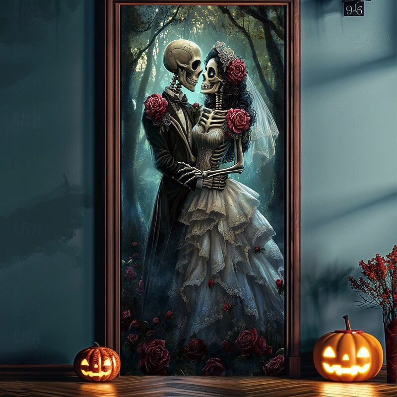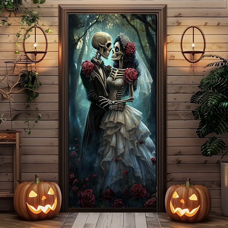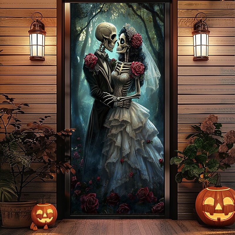 HOT ! Halloween Door Decorations Skull Couple Door Covers Door Tapestry Door Curtain Decoration Backdrop Door Banner for Front Door Farmhouse Holiday Party Decor Supplies