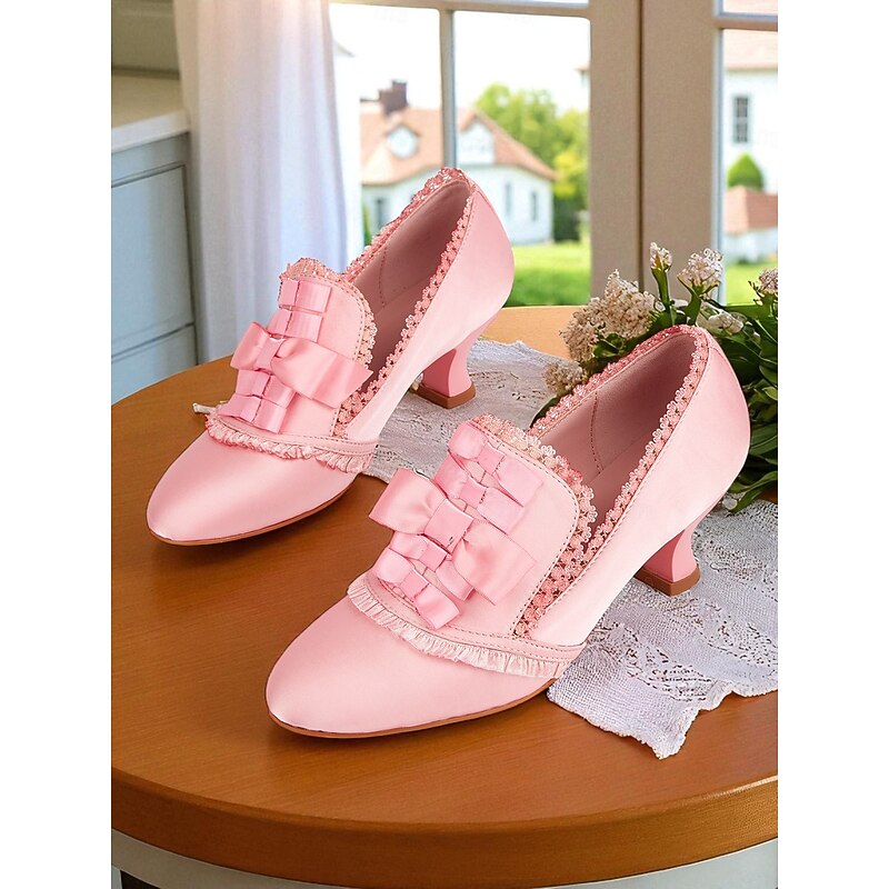 HOT ! Women's Pink Satin Bow Heels with Kitten Heel – 18th Rococo Victorian Court Style Dress Shoes for Cosplay, Tea Party and Historical Reenactments