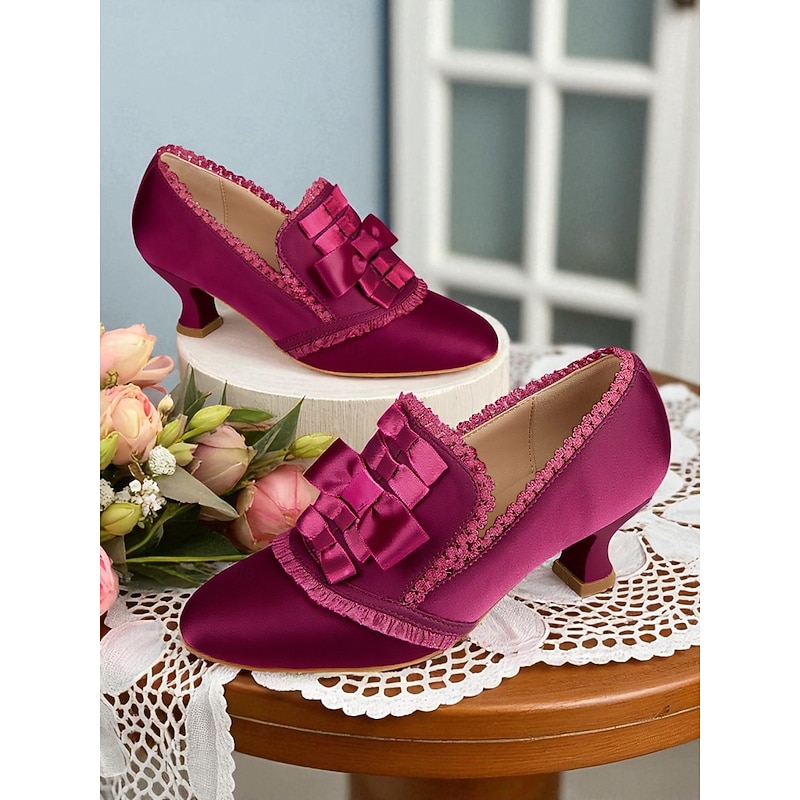 More information about Women's Pink Satin Bow Heels with Kitten Heel – 18th Rococo Victorian Court Style Dress Shoes for Cosplay, Tea Party and Historical Reenactments