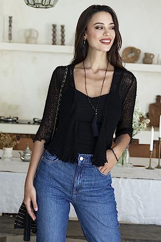 • Tie-front design makes this black Sheer Shrug Knit Cardigan a quick and easy layer; perfect, pretty coverage for upper arms or low-cut dresses
