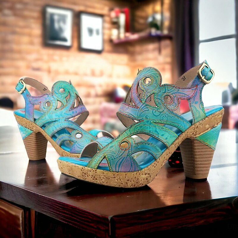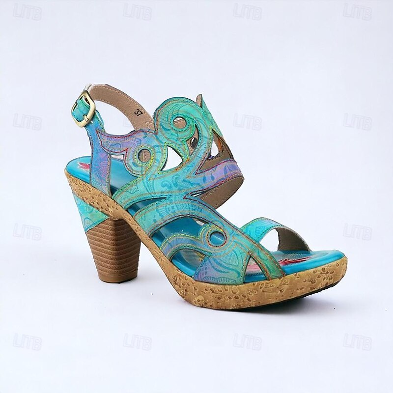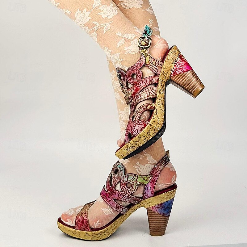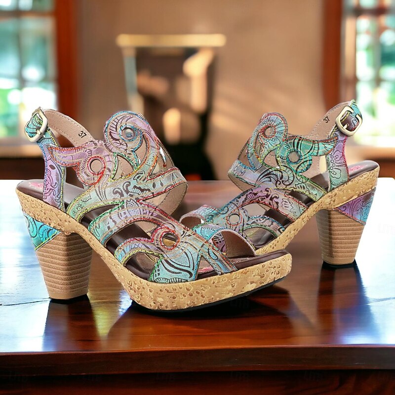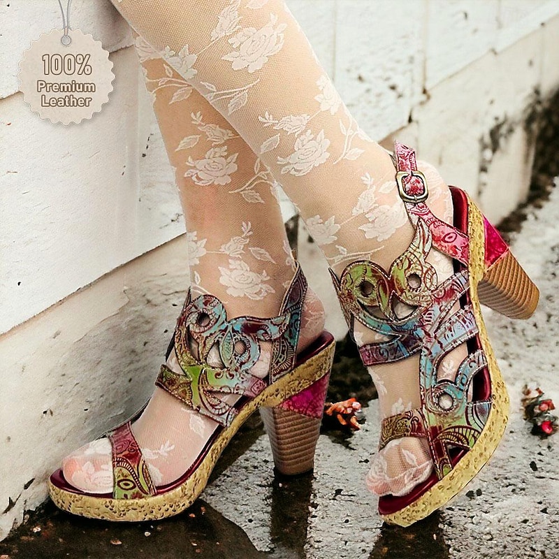 Highlights [Fabric] These elegant women's sandals are crafted from 100% premium cowhide leather, ensuring durability and a luxurious touch. The lining is made from soft sheepskin, providing additional comfort. [Style] With a striking vintage and bohemian design, these sandals feature vibrant, multicolored patterns with floral motifs. The open-toe style and adjustable ankle strap enhance both style and functionality, making them suitable for various occasions. [Design Highlights] The sandals are equipped with a unique cone heel and fantasy heel, delivering both stability and a distinct textured appearance. The handmade craftsmanship is evident in the intricate detailing, adding an artisanal feel to the overall design. [Occasions] Perfect for a wide range of settings, from daily wear and beach outings to parties and travel. These sandals effortlessly blend fashion with practicality, making them a versatile addition to any wardrobe. [Size Range] Available in sizes US6 to US12, these sandals accommodate a variety of foot sizes and provide a comfortable fit for medium heel preferences.