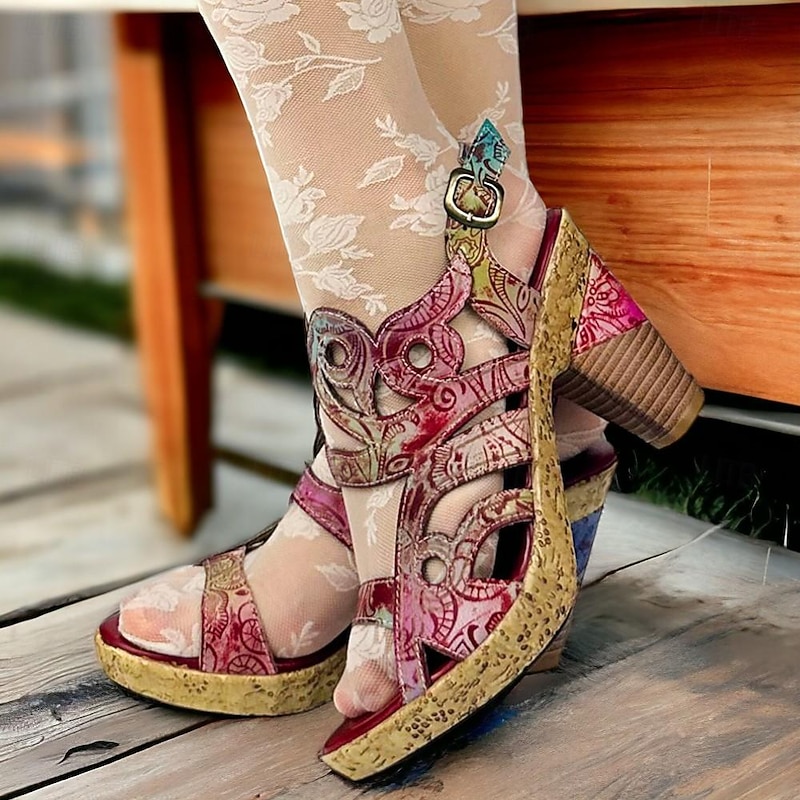 HOT ! Women's Heels Sandals Handmade Shoes Vintage Shoes Party Daily Beach Floral Cone Heel Fantasy Heel Elegant Bohemia Vintage Leather Buckle Red Blue Brown