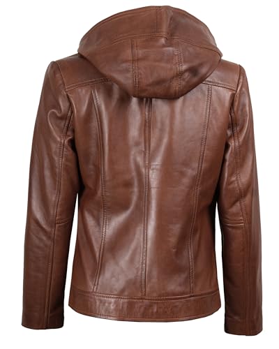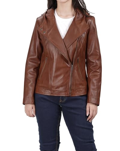• Style with Hood: A fitted cognac hooded leather jacket women with clean, modern lines and an asymmetrical zip front.