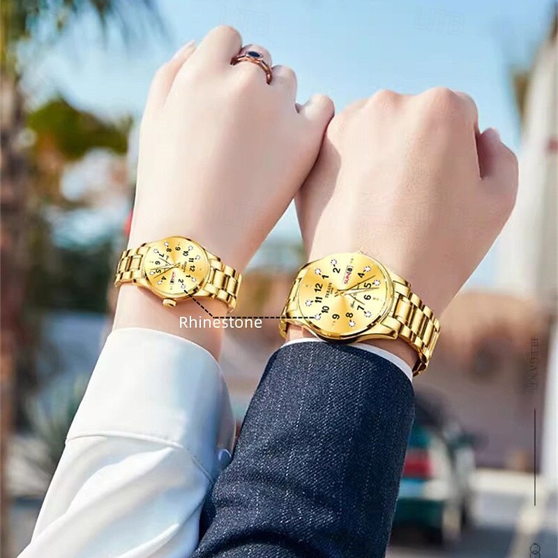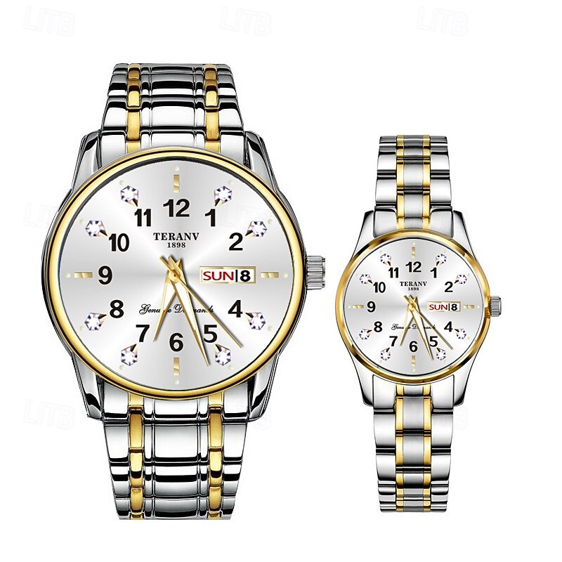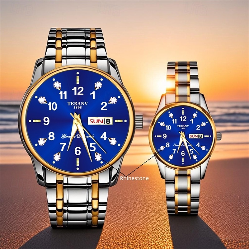2-Piece Couple Quartz Watch Set – Round Digital Dial, IPX7 Waterproof, Luminous Hands, Dual Calendar (Date & Day), Alloy Band, Unisex Business Style, Ideal for Dating & Gifts 13
