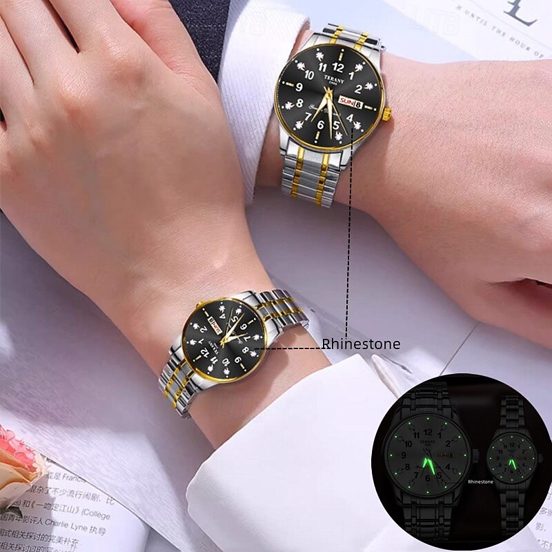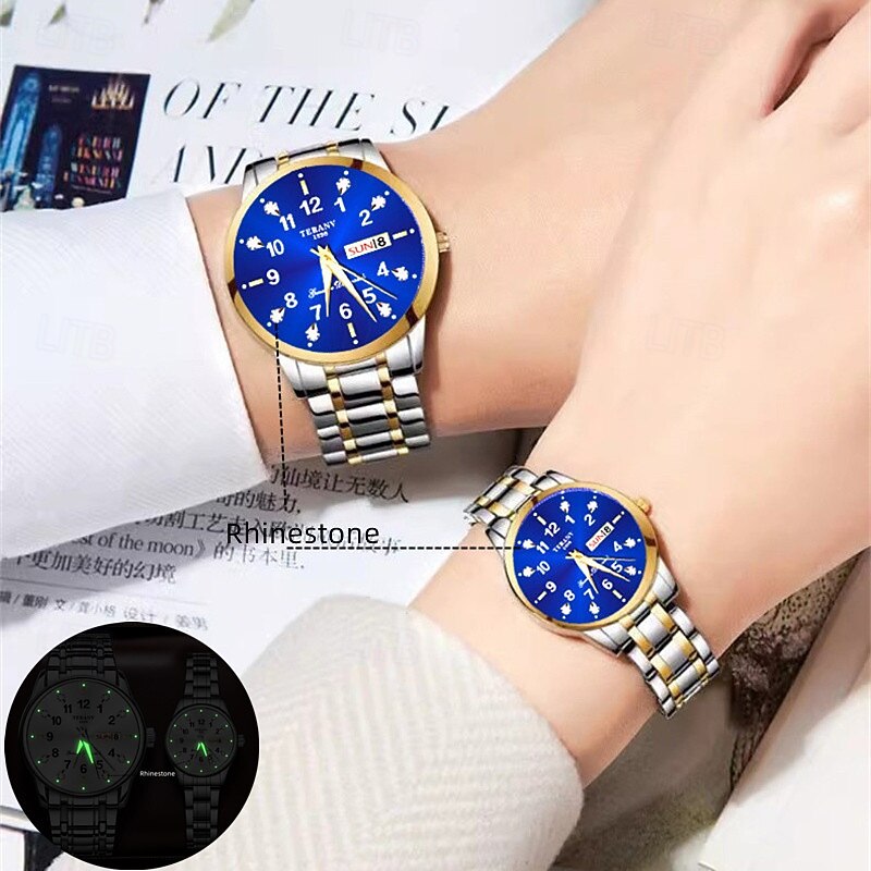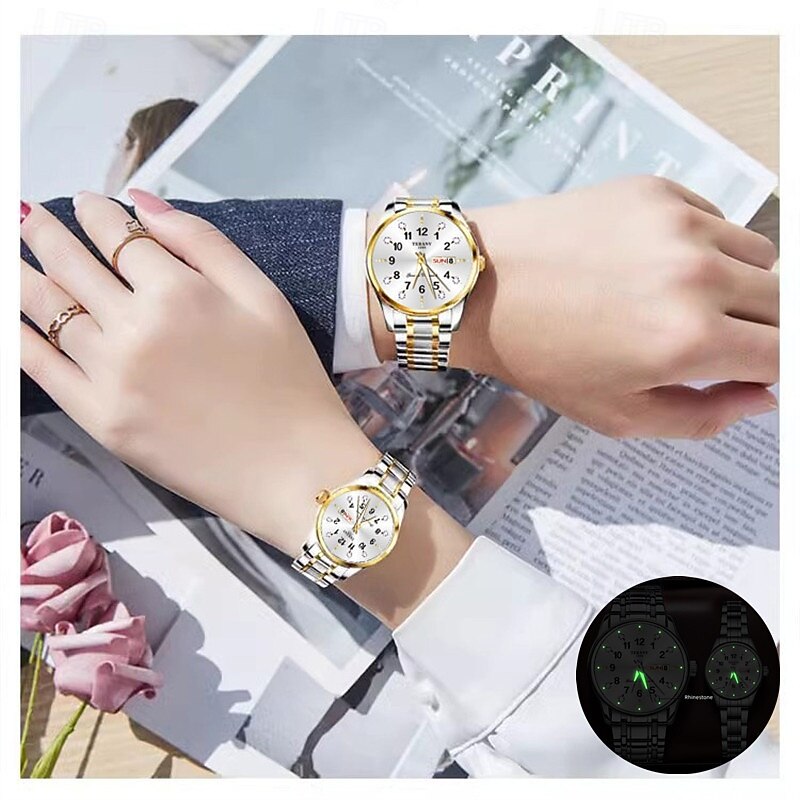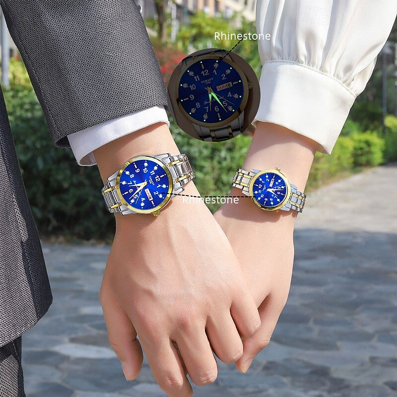 HOT ! 2-Piece Couple Quartz Watch Set – Round Digital Dial, IPX7 Waterproof, Luminous Hands, Dual Calendar (Date & Day), Alloy Band, Unisex Business Style, Ideal for Dating & Gifts