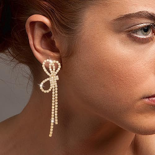 HOT ! Gold Rhinestone Bow Tassel Dangle Earrings Bow Ribbon Dangle Earrings Sparkly Earrings Statement Fringe Earrings Wedding Guest Cute Jewelry For Women Prom Birthday Party Jewelry