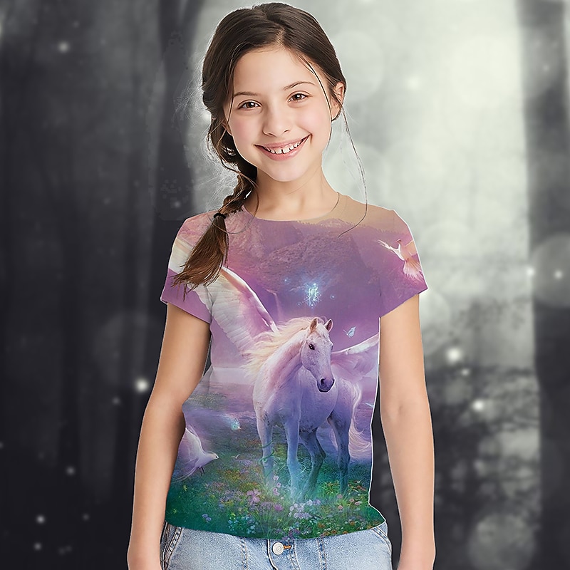 Girls' 3D Graphic Animal Rainbow T shirt Tee Short Sleeve 3D Print Summer Active Cute Kids 2-13 Years School 3
