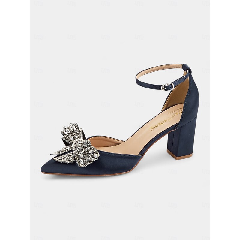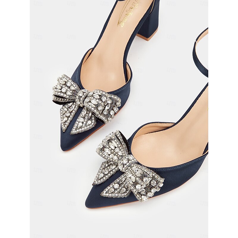 Highlights [Product Highlights] [Fabric] Crafted from premium satin, these women's block heel pumps exude a luxurious sheen that's perfect for any formal occasion. The synthetic leather lining offers enhanced comfort for prolonged wear. [Silhouette] These elegant shoes feature a sleek pointed toe and a chic mid-height block heel that effortlessly combines style with comfort, making them an ideal choice for long events. [Design Highlights] The pumps are adorned with a stunning oversized bow embellished with intricate beadwork and rhinestones at the front, providing a glamorous and sparkling effect. The shoes also boast an adjustable ankle strap with a metallic buckle that ensures a secure fit. [Occasions] Perfect for weddings, parties, and upscale gatherings, these satin pumps are designed to make a chic statement, adding a touch of sophistication to any formal attire. [Size Range] The pumps come in a variety of sizes, ensuring a fit for most. They are designed in standard sizes: US5.5 to US10.5, accommodating a wide range of foot sizes and ensuring everyone can enjoy their elegance and comfort.