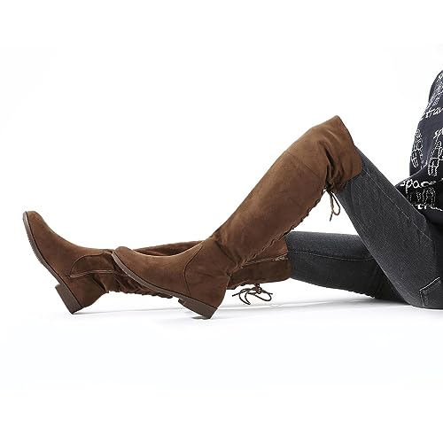 Putu Women's Low Flat Heel Thigh High Boots Faux Suede Boots Over the Knee Sexy Boots with Back Lace up 6