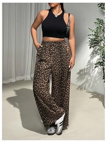 MakeMeChic Women's Plus Size Cheetah Print Wide Leg Summer Pants Casual Drawstring Waist Trousers 6