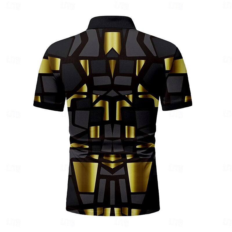 Highlights [Fabric]: Crafted from high-quality milk fiber, this men's polo shirt offers a breathable and comfortable experience, ensuring you stay cool and at ease all day. The fabric provides micro-elasticity, enhancing comfort and allowing for unrestricted movement. [Fit]: Featuring a short sleeve and classic fit design, this polo shirt offers a sleek and versatile silhouette, making it ideal for both casual and smart-casual occasions. The slightly raised collar edge maintains the traditional polo style while adding a modern twist. [Design Highlights]: This shirt stands out with its modern geometric graphic pattern and a striking 3D print, available in black, navy blue, and golden yellow. The quarter zip at the front closure adds a contemporary touch to the classic collared shirt, perfect for a bold fashion statement. [Occasions]: Suited for a variety of occasions, this versatile polo shirt is perfect for vacation wear, rave wear, and party outfits. It combines style with ease, making it ideal for any relaxed or festive gathering. [Size]: Available in a wide range of sizes, including S, M, L, XL, XXXL, 4XL, and 5XL, this polo shirt caters to a broad age group of adult men seeking comfort and style.