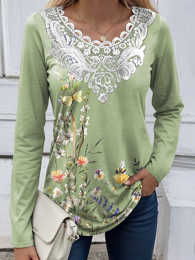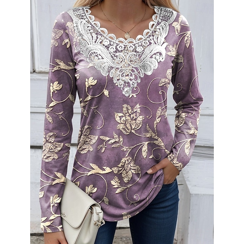 Women's Blouse Tunic Lace Splicing V Neck Long Sleeve Floral Graphic Plants Vintage Crew Neck Tops Daily Going out Weekend Lace Patchwork Print White Yellow Blue Sky Blue Purple Spring Fall Prefall 24