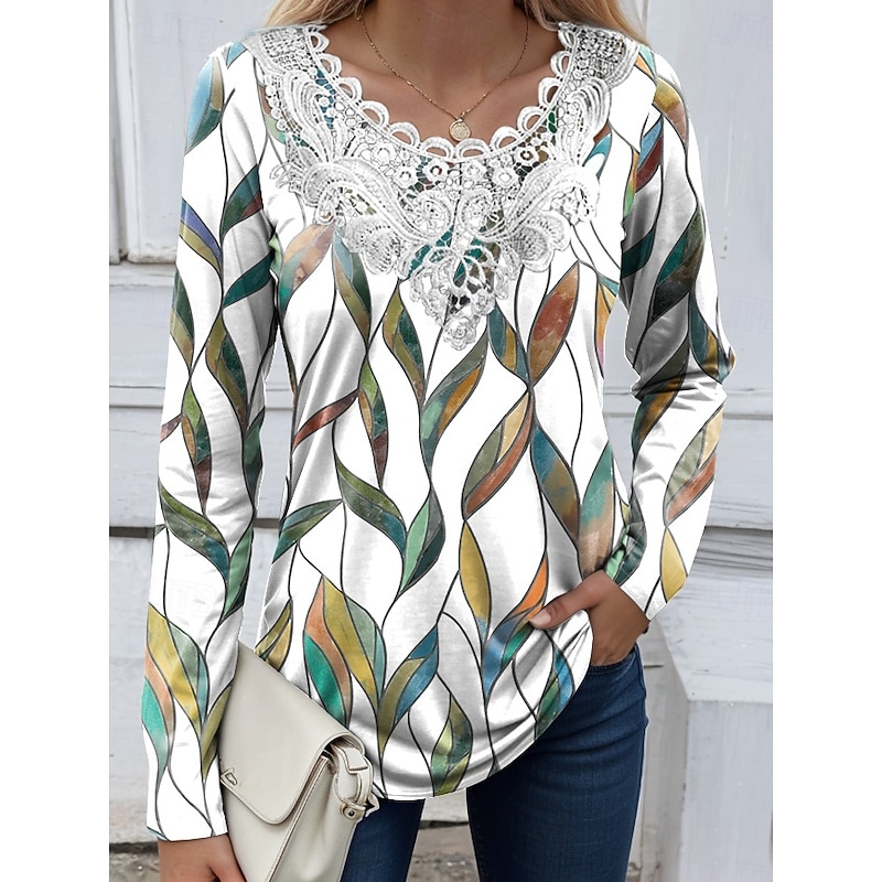 More information about Women's Blouse Tunic Lace Splicing V Neck Long Sleeve Floral Graphic Plants Vintage Crew Neck Tops Daily Going out Weekend Lace Patchwork Print White Yellow Blue Sky Blue Purple Spring Fall Prefall