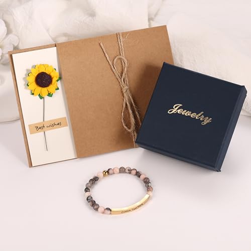 HOT ! MeMeDIY Personalized Bracelets for Women Natural Stone Stretch Bracelet Stainless Steel Bar Engraved Name Inspirational Message 7.5" Beaded Stretch Bracelet