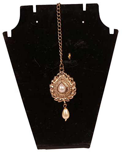• NEW! Touchstone Indian Bollywood Traditional Grain Work Petals Patterns Studded Diamond Look Faux Pearl Designer Jewelry Mangtika Accessory In Antique Gold Tone For Women. SPECIFICATTIONS: Mangtika Weight 8 Gms. Length 6.50 Inches. Width 1 Inch.