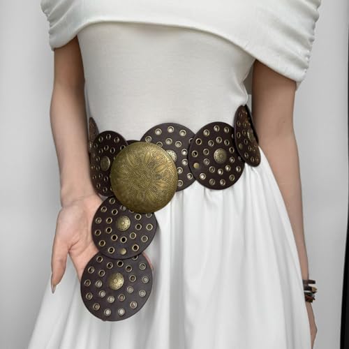 HOT ! Western Leather Belts for Women Vintage Boho Cowgirl Belt with Concho Wide Disc Belt for Dresses Jeans Skirts