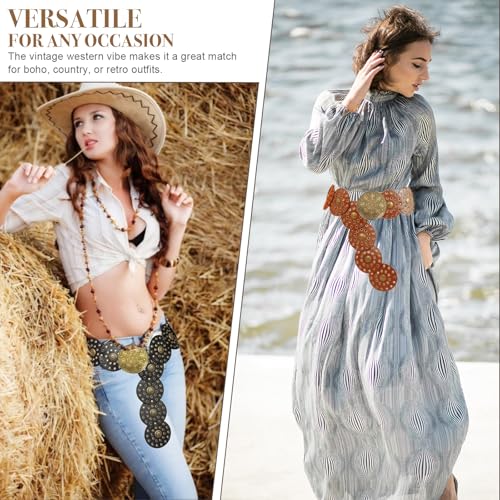 Western Leather Belts for Women Vintage Boho Cowgirl Belt with Concho Wide Disc Belt for Dresses Jeans Skirts 4