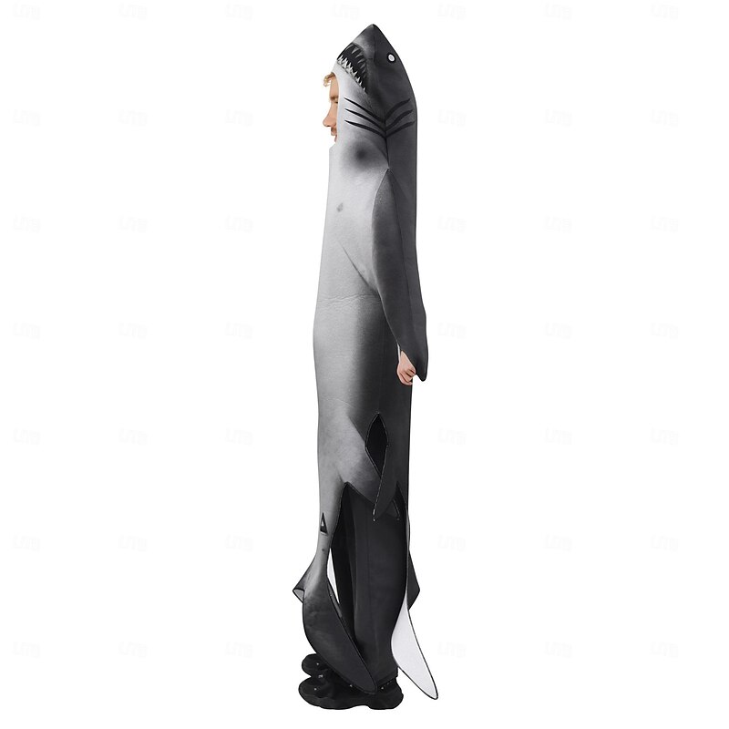 Highlights [Shark Starfish Carnival Costume] : [Fabric] : The costume is crafted from a blend of polyester and spandex, ensuring a plush and soft feel. This combination provides flexibility, allowing for comfortable and prolonged wear, making it ideal for active events or performances. [Fit] : Designed with a full-body silhouette, the costume achieves a streamlined, cartoonish shark appearance. The micro-elastic fabric ensures a snug yet comfortable fit, accommodating a wide range of movements. [Design Highlights] : Featuring a gradient color transition from gray to white, the costume mimics the natural patterns of a shark. The design includes fin-like extensions on the sides and a tail-inspired hem at the bottom. The strategically positioned face opening in the shark's mouth is adorned with printed teeth for a whimsical touch, offering both visibility and ventilation. [Occasions] : Perfect for a variety of events, including performances, parties, Halloween celebrations, and themed gatherings. This playful costume adds a touch of marine life magic to any event, making it a delightful choice for family photos and carnival festivities. [Size Range] : Available in sizes S, M, and L, accommodating both children and adults, making it a versatile choice for group costumes or family-matching ensembles.