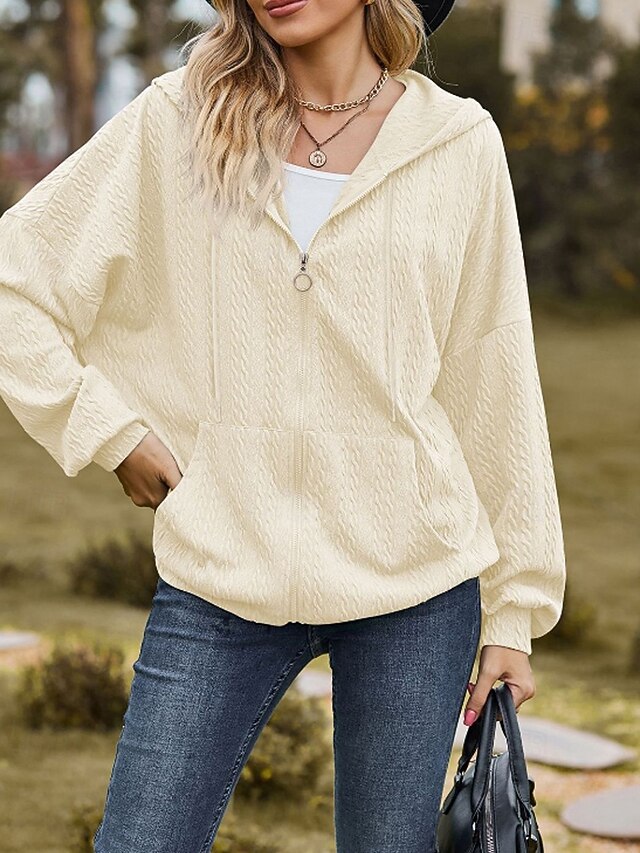 Women's Texture Sweatshirt Zip Up Hoodies Plain Streetwear Casual Long Sleeve Hooded Regular Tops Street Holiday Going out Zipper Pocket Light Pink Black Wine Navy Blue Blue Fall Winter 22