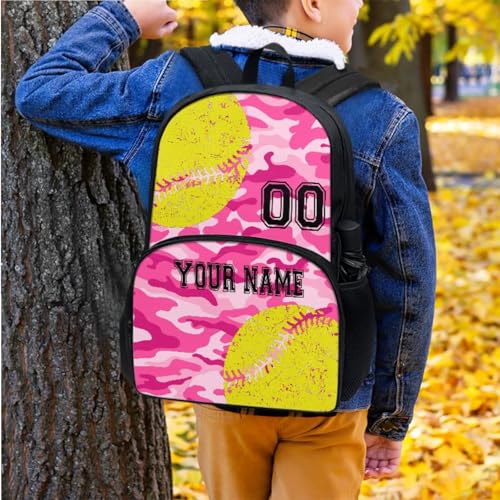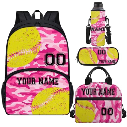 HOT ! Big Student Softball Pink Camo Personalized School Backpack 17 Inch Schoolbag Book Insulated Lunch Bag Bookbag Pen Water Bottle Bag Stationery Pouch for Little Kids Girls Boys Teens