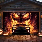 HOT ! Halloween Garage Door Cover Large Hanging Backdrop Skeleton Flame Car Dark Punk Gothic Style Party Outdoor Shooting Backgrounds Yard Haunted House Home Decor