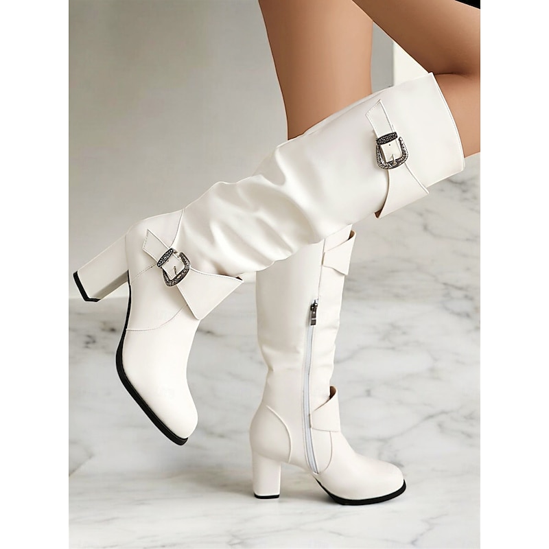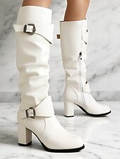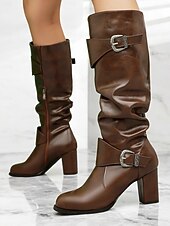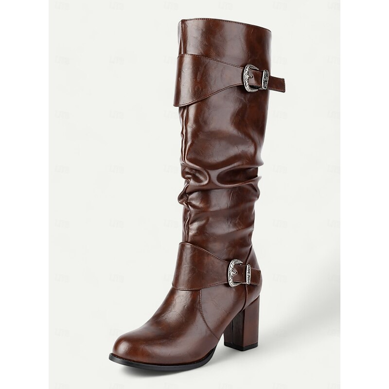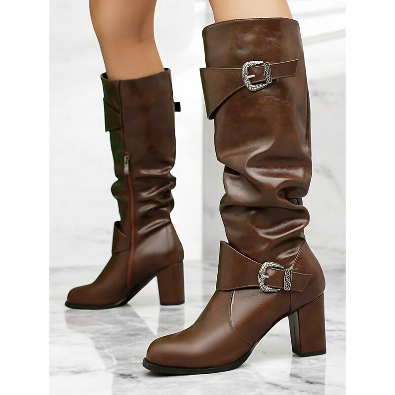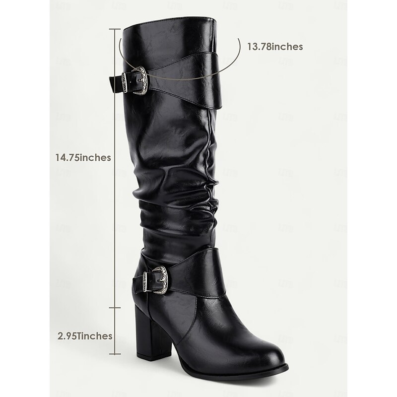 Highlights [Fabric & Material] : Crafted from high-quality PU, these women's knee-high boots offer a glossy faux leather finish that exudes sophistication. The synthetic leather lining adds durability, creating a pair of boots perfect for long-lasting wear through fall and winter. [Fit & Style] : These boots sport a knee-high length with a vintage yet elegant design, featuring a round toe and a chunky heel that presents a classic silhouette. The sturdy block heel ensures both height and comfort, blending style with practicality. [Design Highlights] : Stand out with the stylish buckle and ankle strap embellishments, adding a touch of edginess and flair. The boots include a convenient inner side zipper for a secure fit and ease of wear, while the slouchy design delivers a chic, laid-back vibe. [Occasions] : Perfect for a variety of settings, these boots transition effortlessly from daily errands and office wear to casual outings. Whether you're strolling through a crisp autumn day or heading to work, they provide a bold statement for any occasion. [Size Notice] : Available in standard sizes ranging from US5.5 to US10.5, these boots are designed to fit true to size. Select your usual size for the best fit and enjoy the combination of comfort and style.