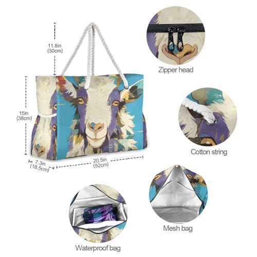 Vintage Colorful Goat Sandproof Totes For Women with side pocketes Large Beach Bag for Travel Gym Vacation 5