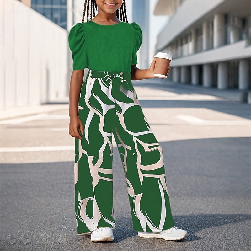 More information about 2 Pieces Kids Girls' Solid Color Puff Sleeve T-shirt & Pants Set Short Sleeve Fashion Outdoor 4 years+ Summer Black Red Green