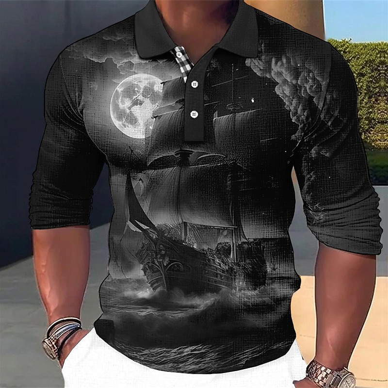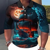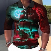 HOT ! Men's Haunted Pirate Ship Polo Shirts Golf Shirt Long Sleeve Polo Shirts Collared Shirts Vintage Casual Vacation Wear Boat Wear Party Outfits 3D Print Buttons Red Royal Blue Blue