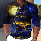 More information about Men's Haunted Pirate Ship Polo Shirts Golf Shirt Long Sleeve Polo Shirts Collared Shirts Vintage Casual Vacation Wear Boat Wear Party Outfits 3D Print Buttons Red Royal Blue Blue