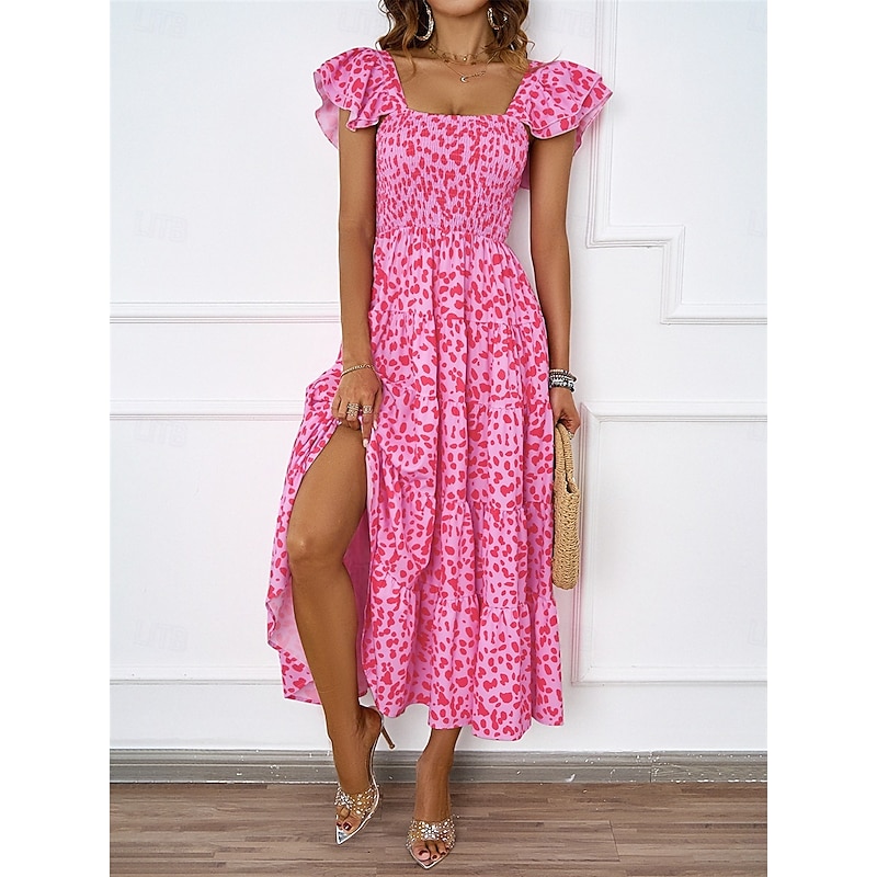 HOT ! Women's Floral Square Neck Midi Dress Short Sleeve Summer Spring