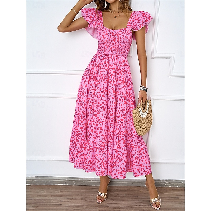 Women's Floral Square Neck Midi Dress Short Sleeve Summer Spring 1