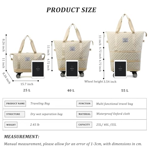 • Rolling Duffle Bag With Wheels : The rolling luggage bag with wheels is made from wear-resistant, scratch-resistant, and waterproof Oxford cloth with a polyester lining. Features a reinforced handle for easy carrying and pulling, durable metal zipper, and at the bottom, there are four removable and install-able 360°silent universal wheels, allowing for smooth and flexible movement in any direction