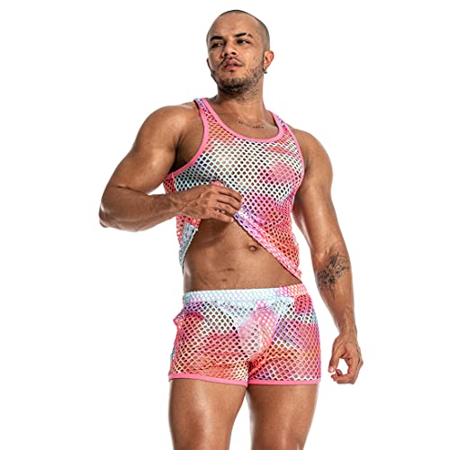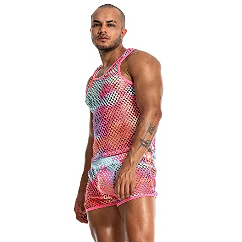 • FASHION DESIGN: This sleeveless fishnet shirt is designed in tank top style, the see-through mesh shirt is well-cut, so you can do any action without any constraints, showing the male sex appeal. The mesh fabric is color-coordinated with a unique tie-dye process, which is fashionable and colorful, allowing you to shine in the crowd and release your unique charm